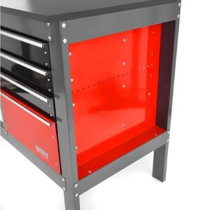 Műhelyasztal 450 kg teherbírással. Stabil fémszerkezet. Ideális bármilyen műhelybe. Rendezze magát – az asztalon 3 sekély és egy mély fiók található a szerszámok tárolására. Két felső szekrény és egy hátlap állítható kampókkal a szerszámok felakasztására. Méretei 120 x 58 x 174 cm. Súlya 53 kg.