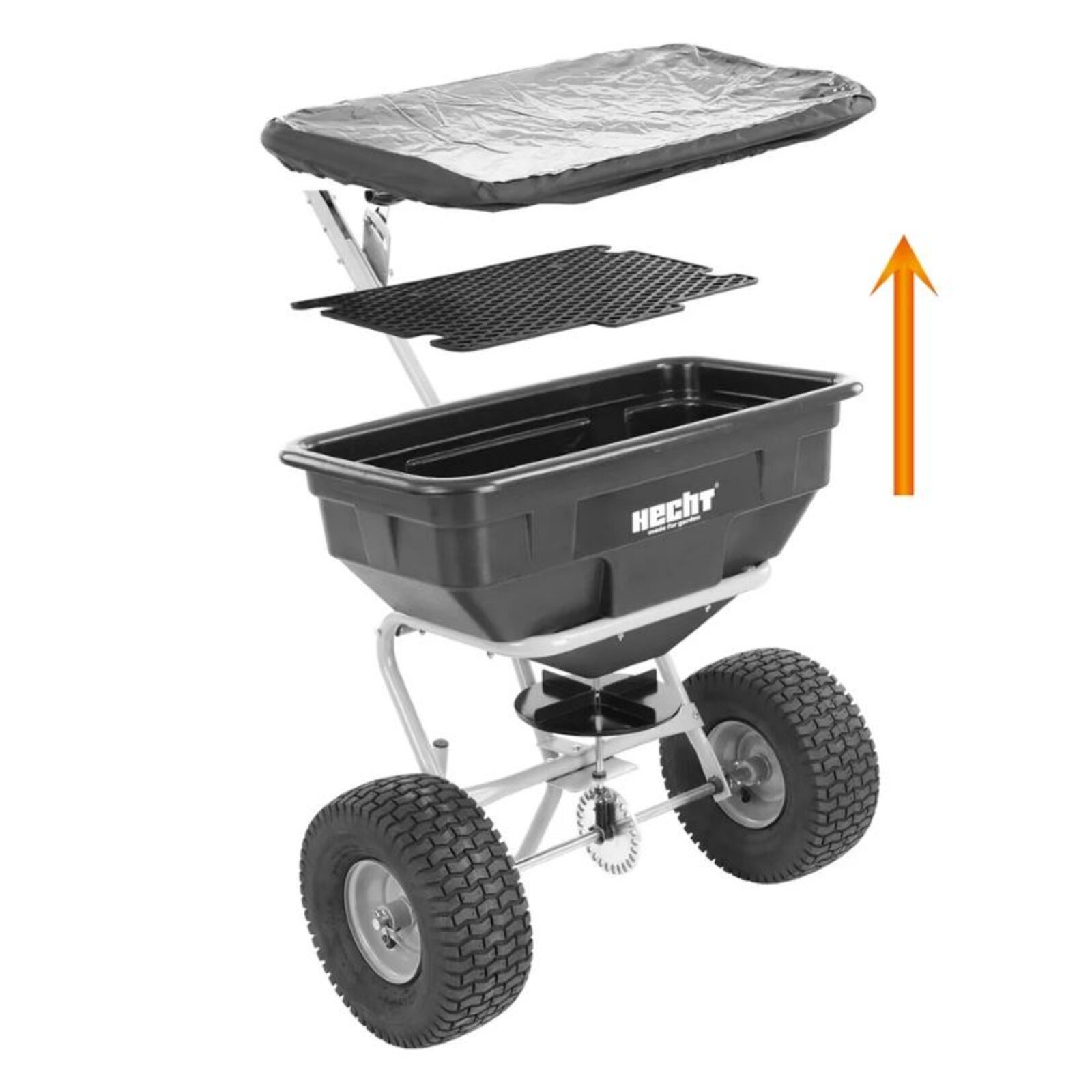 Hecht 256 Szórókocsi vontatható műtrágya, vetőmag és útszóró só szórására alkalmas szórókocsi, ami nagy segítséget nyújthat nagy területek rendben tartásánál, mint a kerti traktor kiegészítője. A kerekek forgatónyomatékát hasznosítja a szórórendszer meghajtására. Ez biztosítja az egyenletes szórást – a kiszórt anyag mennyisége egyenesen arányos a megtett úttal. A szórás erőőségének szabályozása a vonórúdon található kar segítségével történik. Így a kar, a kerti traktorok többségénél, könnyen elérhető a vezető ülésből, ami lehetővé teszi a szórás tetszőleges megszakítását. A kar a szórás erősségének beállítására is szolgál. A tartályban 60 l vetőmag, műtrágya vagy útszóró só fér el, és rostával van ellátva, hogy megakadályozza a szórórendszer eltömődését. Tartozékként takaróponyvát is adunk a szórókocsihoz.