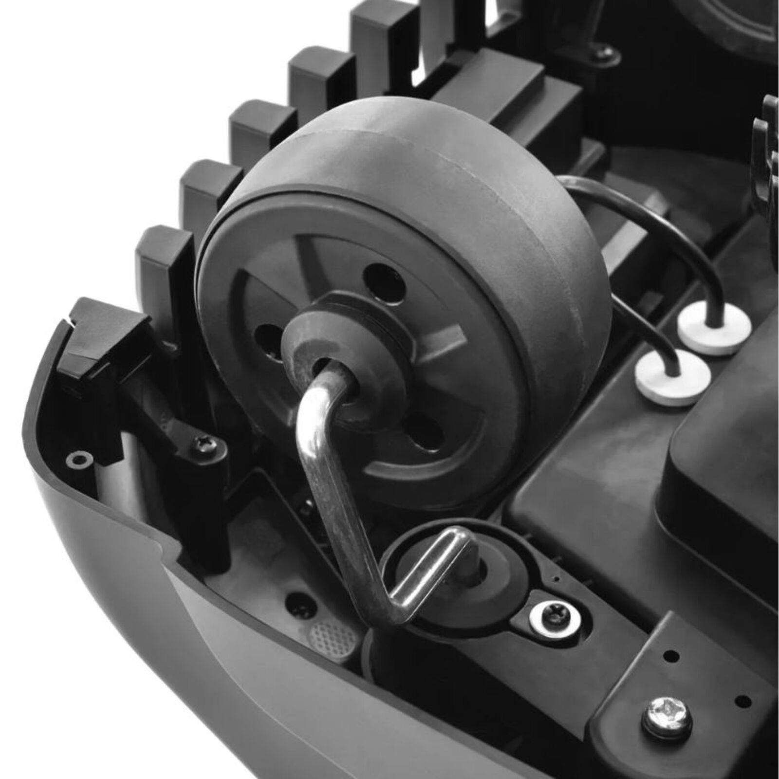 A fűnyírót PIN kód védi a lopás ellen. A tudta nélkül a fűnyírót nem lehet elindítani, így a fűnyíró a tolvajok számára használhatatlan. A fűnyíró alatt teljesen elrejtett fej három pengével forog, ami veszélyes lehet a fűnyíró felemelésekor vagy felborulásakor. Ezért a gép érzékelőkkel van felszerelve, amelyek biztosítják, hogy a kések azonnal leálljanak, amikor a fűnyírót felemeli. Egyéb előre nem látható helyzetekre a fűnyíró felső burkolatán egy nagy gombbal van felszerelve, amely szintén bármikor azonnal leállítható. A vágási magasság 20-60 mm között állítható.