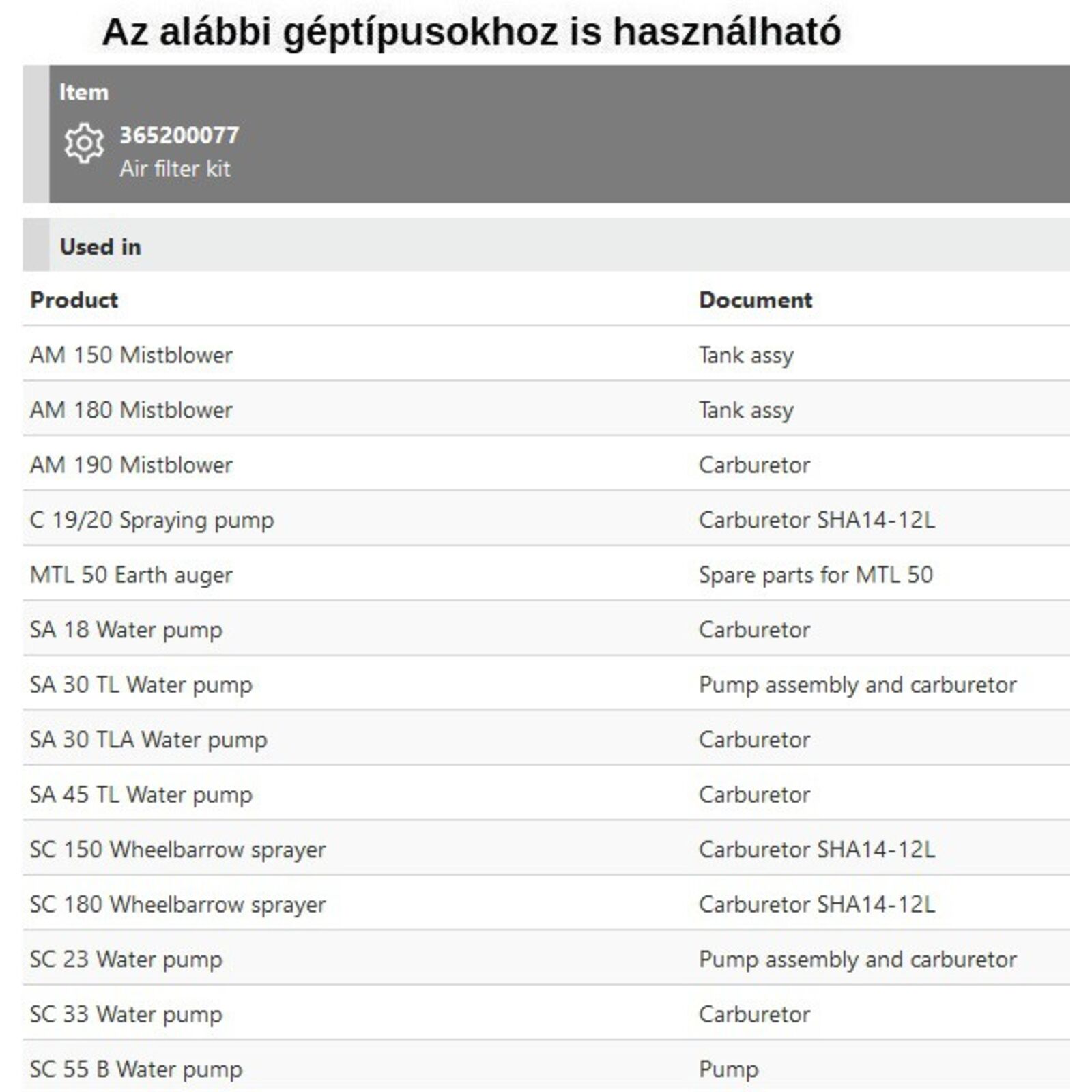 Tipusok: AM 150, AM 180, AM 190, C 19/20, MTL 50, SA 18, SA 50 TL, SA 45 TL, SC 150, SC 180, SC 33, SC 55 B,