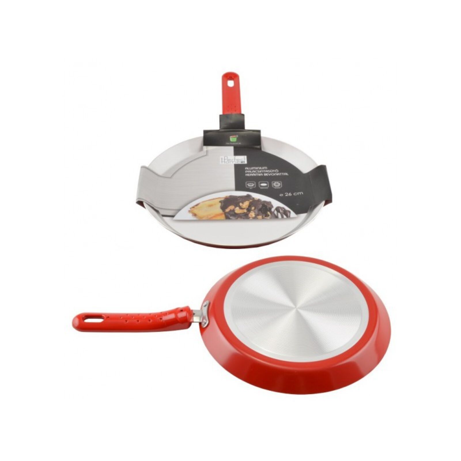 Anyaga: nemtapadó kerámia bevonattal ellátott alumínium, műanyag Mérete: 26 cm átmérőjű felül, 25,4 cm átmérőjű alul, 2,3 cm magas, 18,3 cm hosszú a nyele, 45,7 cm hosszú nyéllel együtt Használható: gáz-, kerámialapos -, elektromos-tűzhelyen egyaránt.