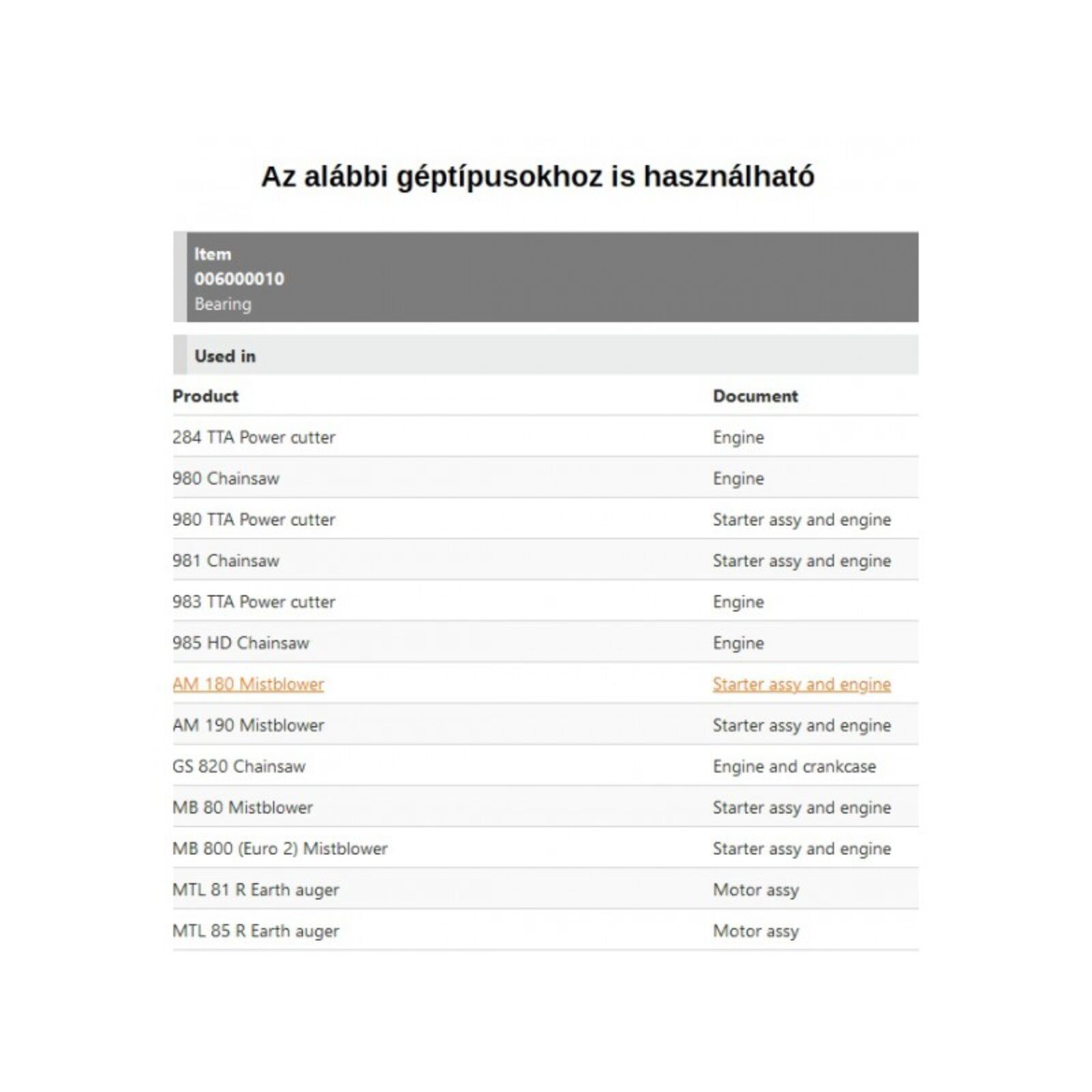 Típusok: 284 TTA, 980, 981, AM 180, AM 190, GS 820, MB 80, MB 800, MTL 85
