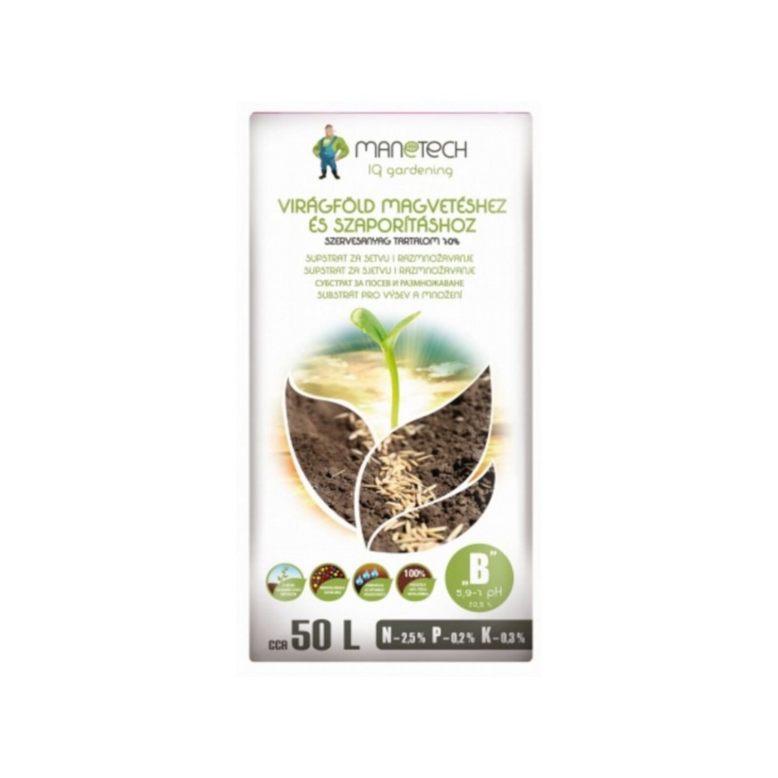 Speciálisan gyártott virágföld növények magvetésére és szaporítására. Gondosan kiválasztott barna tőzegből, agyagásványok és fokozatosan oldódó NPK műtrágya hozzáadásával van előállítva. A tőzeg gátolja a gyökér betegségek kialakulását, viszont sok tápanyagot és mikroelemeket tartalmaz. Kiváló minősége biztosítja megfelelő víz mennyiséget, és az ideális hőmérsékletet a környezeti levegő lehűlése esetén is. Agyag tartalma növeli a tápanyagok elraktározódását, és gátolja ezek kimosodásait. Az indító műtrágya lassú lebomlású NPK műtrágyát tartalmaz, ami 2 hétre elegendő tápanyagot biztosít. A földkeverék műtrágya tartalma jó hatással van a palánták, vetemények, hajtások egészséges gyökerezésére és csírázására. módosított pH: 5,4 – 6,4 N – 0,3% P2O5 – 0,1% K2O – 0,3%