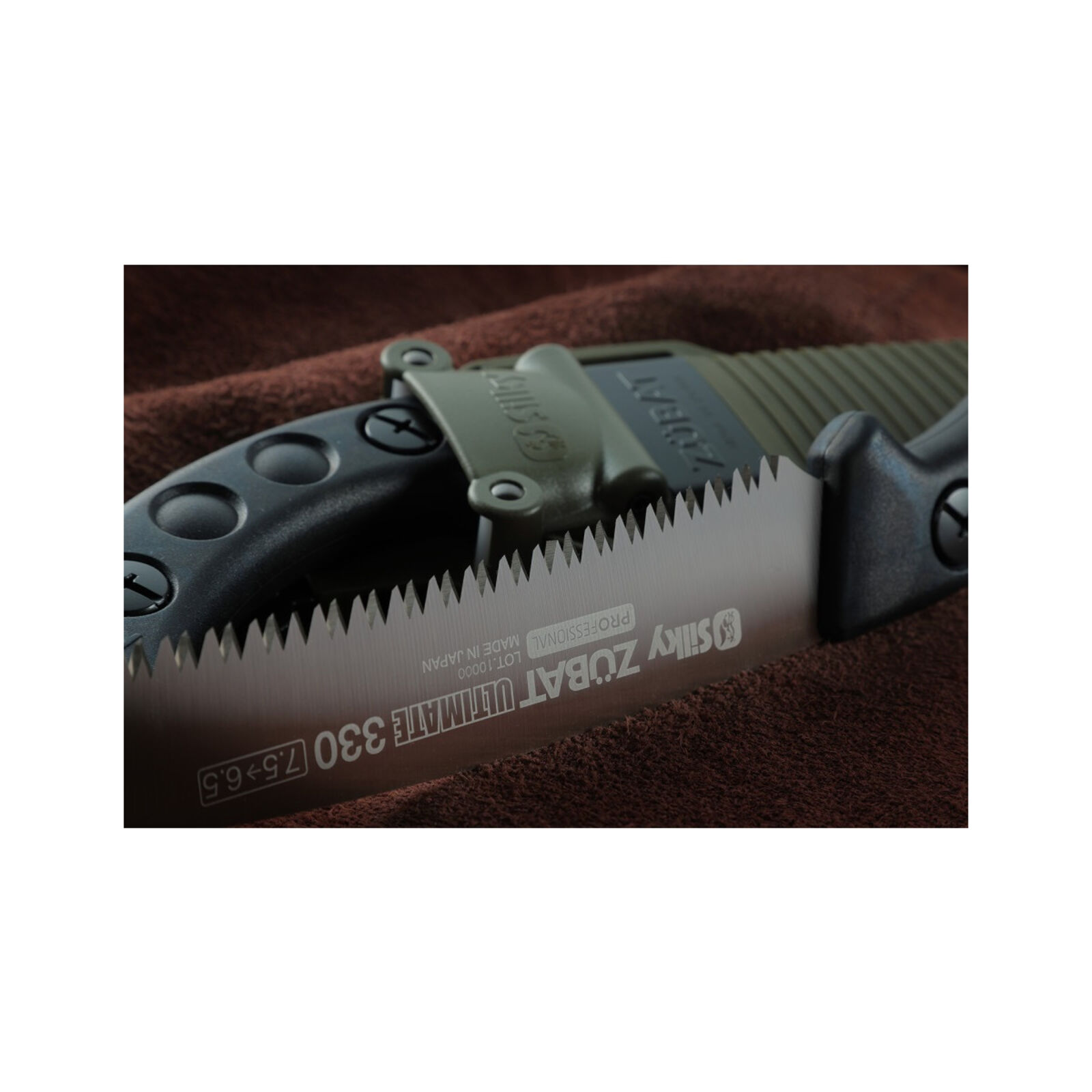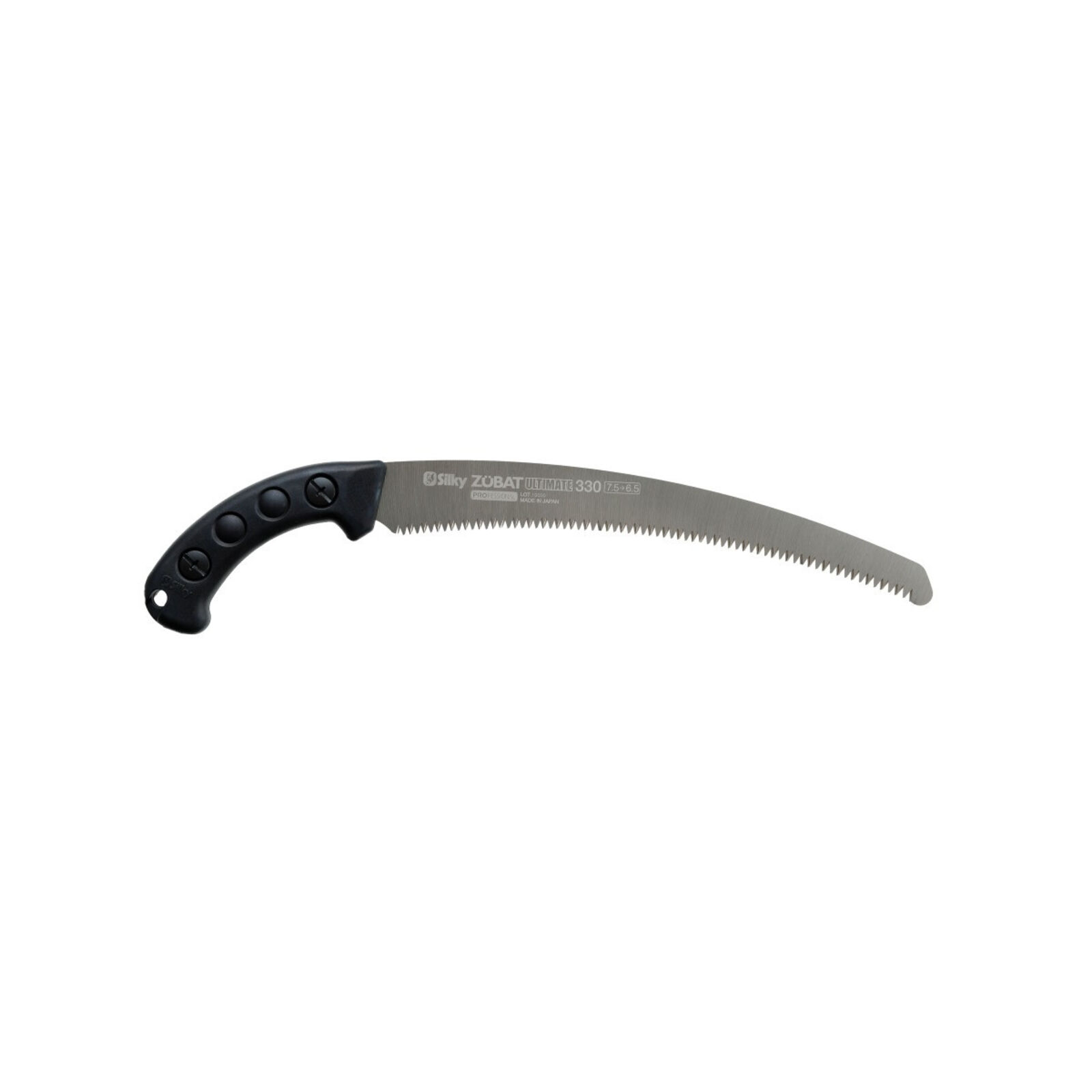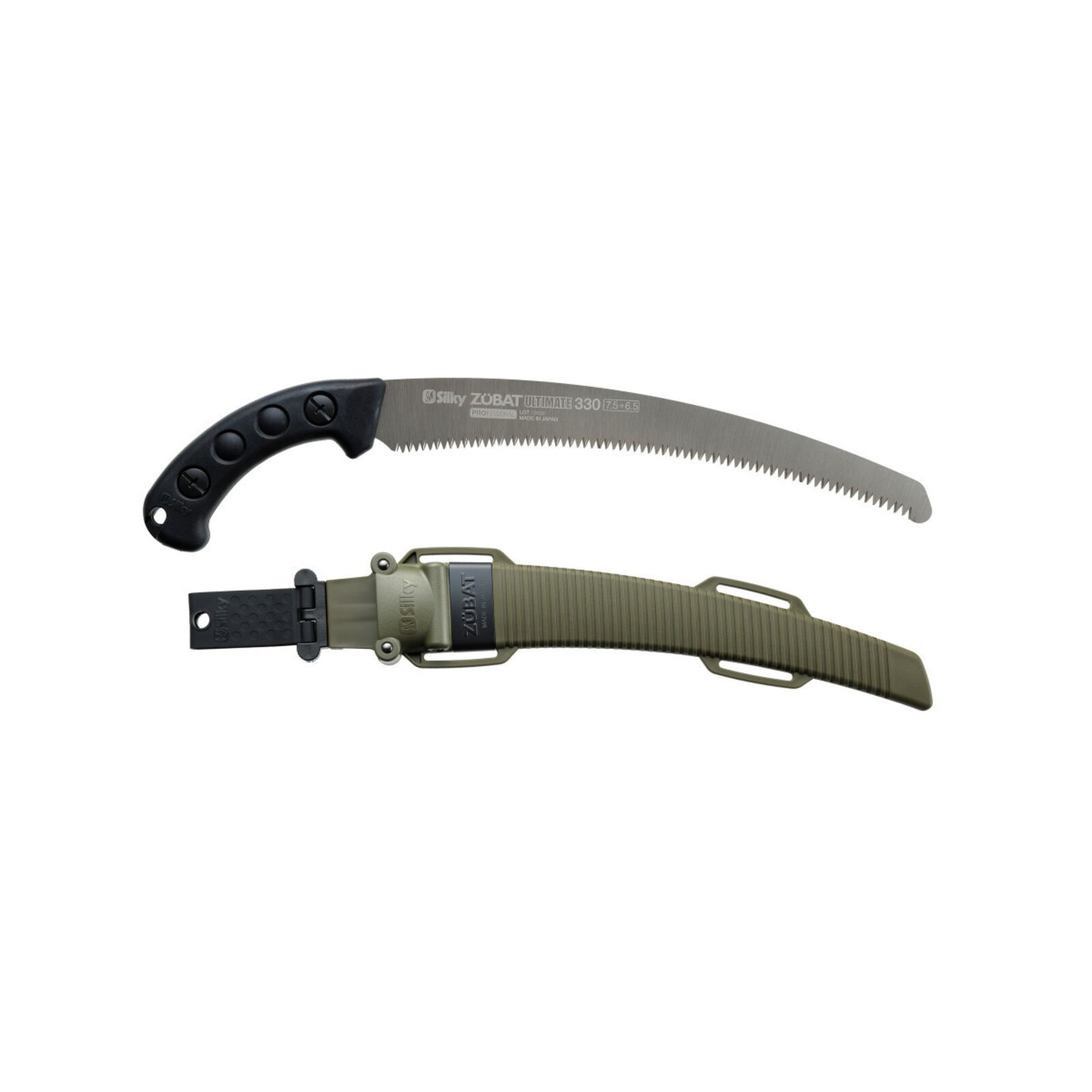 Progresszív fogkialakítása miatt ( 7,5-6,5 fog/30 mm) az első vágás rendkívül könnyen elvégezhető, ami után nagy sebességgel lehet áthasítani a fát. A Zübat Ultimate egyben az első fűrész a Silky új Gokai-Me fogaival. A pengének 4 kaparó alakú foga van, amelyek biztosítják a fűrészpor optimális elvezetését. A Zübat Ultimate kiváló teljesítményt nyújt mind hasításnál, mind keresztvágásoknál, mind a ferde vágásoknál. Igazi sokoldalú szerszám! A penge végig fut a markolaton, nikkel bevonattal rendelkezik, amely kopásálló felületet biztosít és véd a rozsdától. Az ívelt penge tökéletesen működik vállmagasság feletti vágáskor és a fűrészt a vágásban tartja. A Zübat Ultimate öntött gumi fogantyúval rendelkezik, amely kényelmesen illeszkedik a kézbe és jelentősen csökkenti a vibrációt. A fűrészt forgatható, olívazöld tokban szállítjuk, levehető övtartóval és 3 kis görgővel van felszerelve, hogy az éles fogak ne sértsék meg a burkolatot a fűrész be- és kivételekor. A tok alján egy nyílás található, amely lehetővé teszi a nedvesség és a fűrészpor kihullását. A Zübat Ultimate penge a Zübat ágvágó sorozat modelljeire is felszerelhető. Penge hossza: 330 mm Fogak: 7.5-6.5 / 30 mm